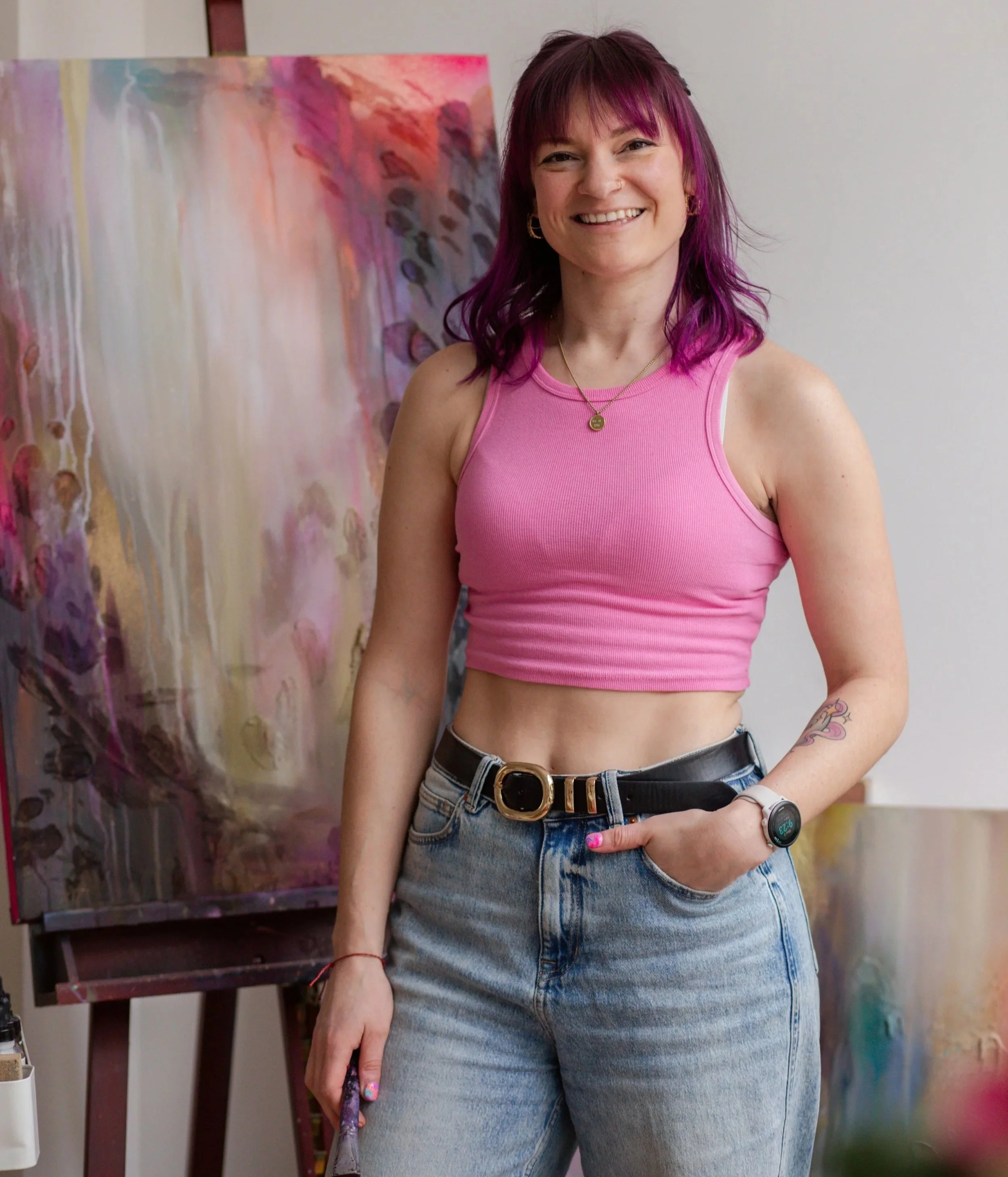Since 2022, Hannah has committed fully to this direction, developing a distinctive body of work that spans abstract painting, large-scale murals, and expressive, playful portraits. Her work is characterised by bold movement, energetic mark-making, and an intuitive exploration of emotion. Celebrating freedom, joy, and the physical act of creation itself. Each piece reflects a confident, evolving practice that invites both contemplation and connection.