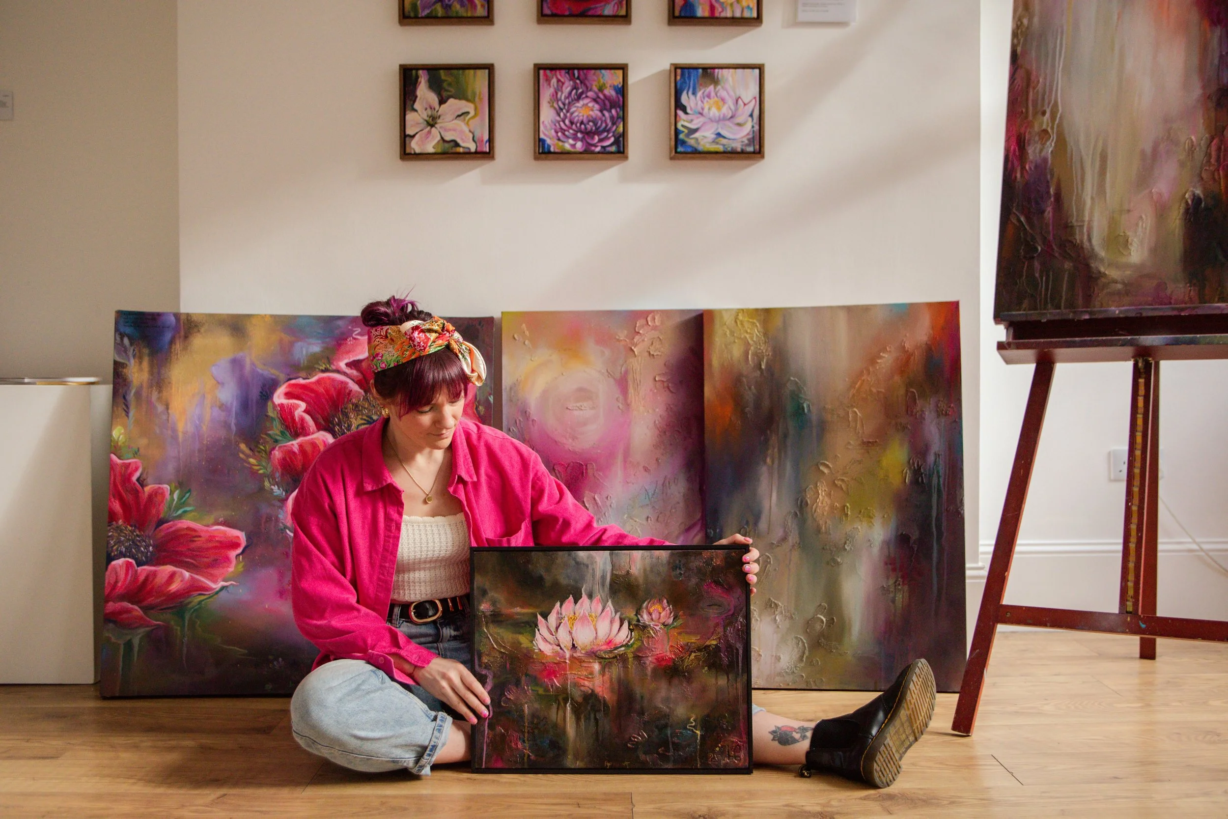 Hannah began her creative practice as a digital illustrator, producing work for publications, social platforms, and workshops. A pivotal shift came during the 2020 pandemic, when a period of collective uncertainty led her back to painting by hand. This return marked the beginning of a more instinctive and emotionally driven practice, using paint as a means to process experience and inner landscapes.